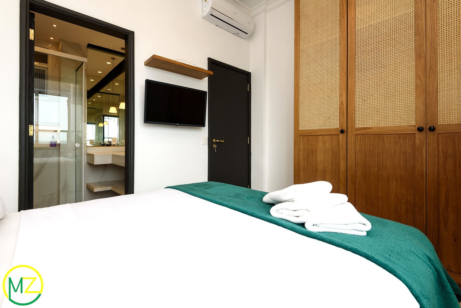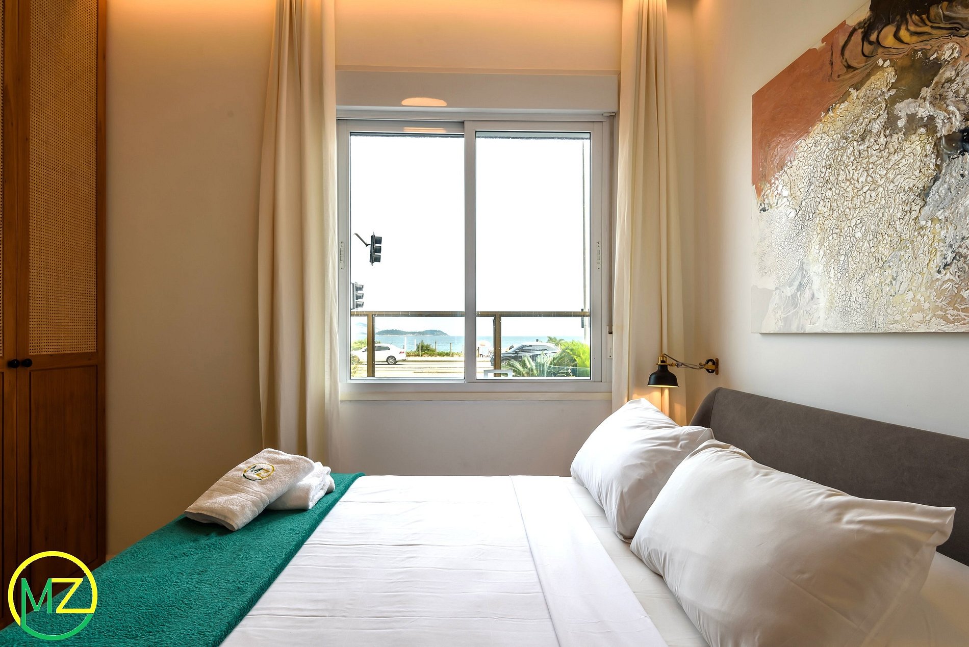 The second bedroom (suite) has a queen-size bed, 32-inch SmartTV, wardrobe and split air conditioning. Front view of Ipanema beach.