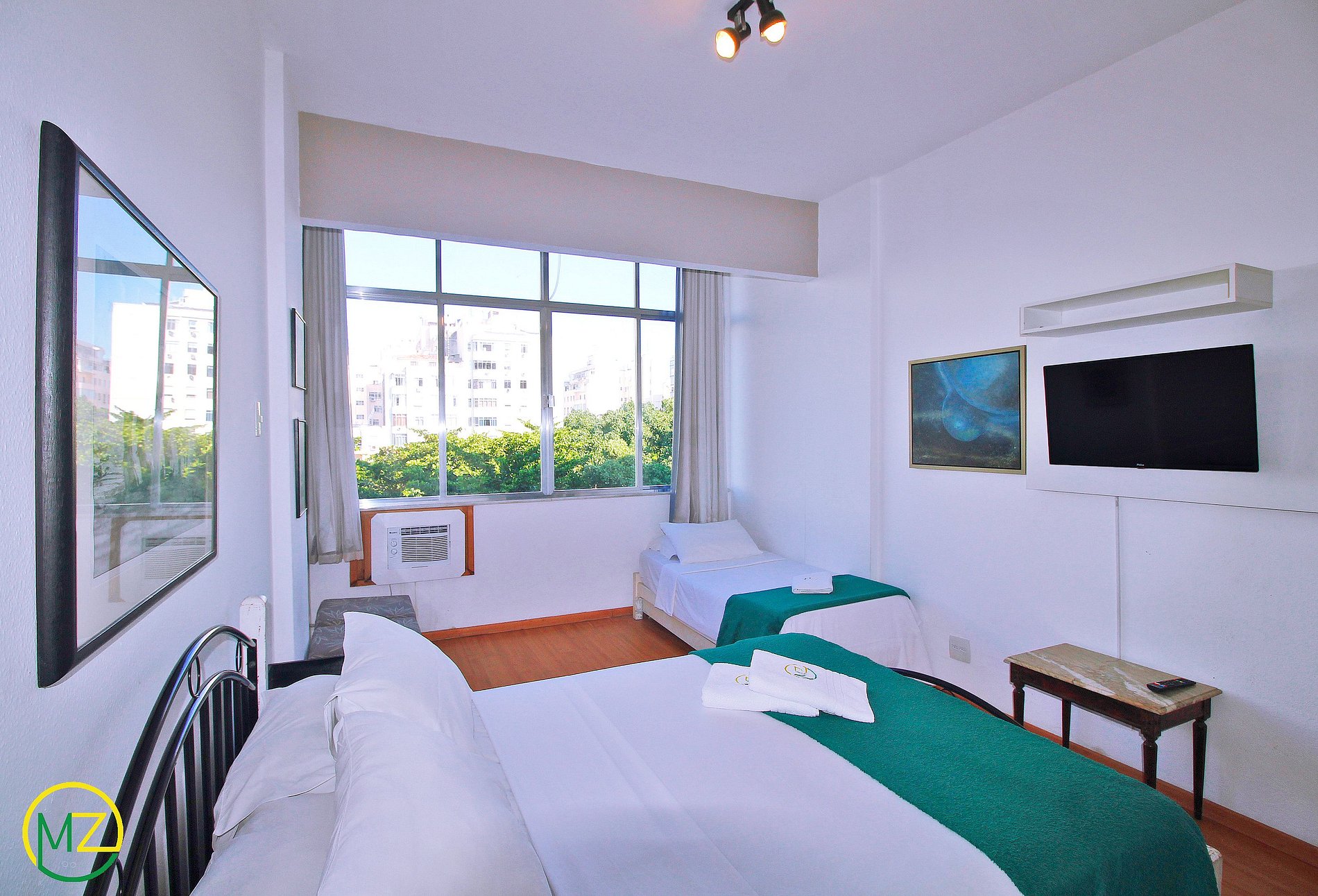 Room composed of double bed, single bed, wardrobe, SmartTV and air conditioning.