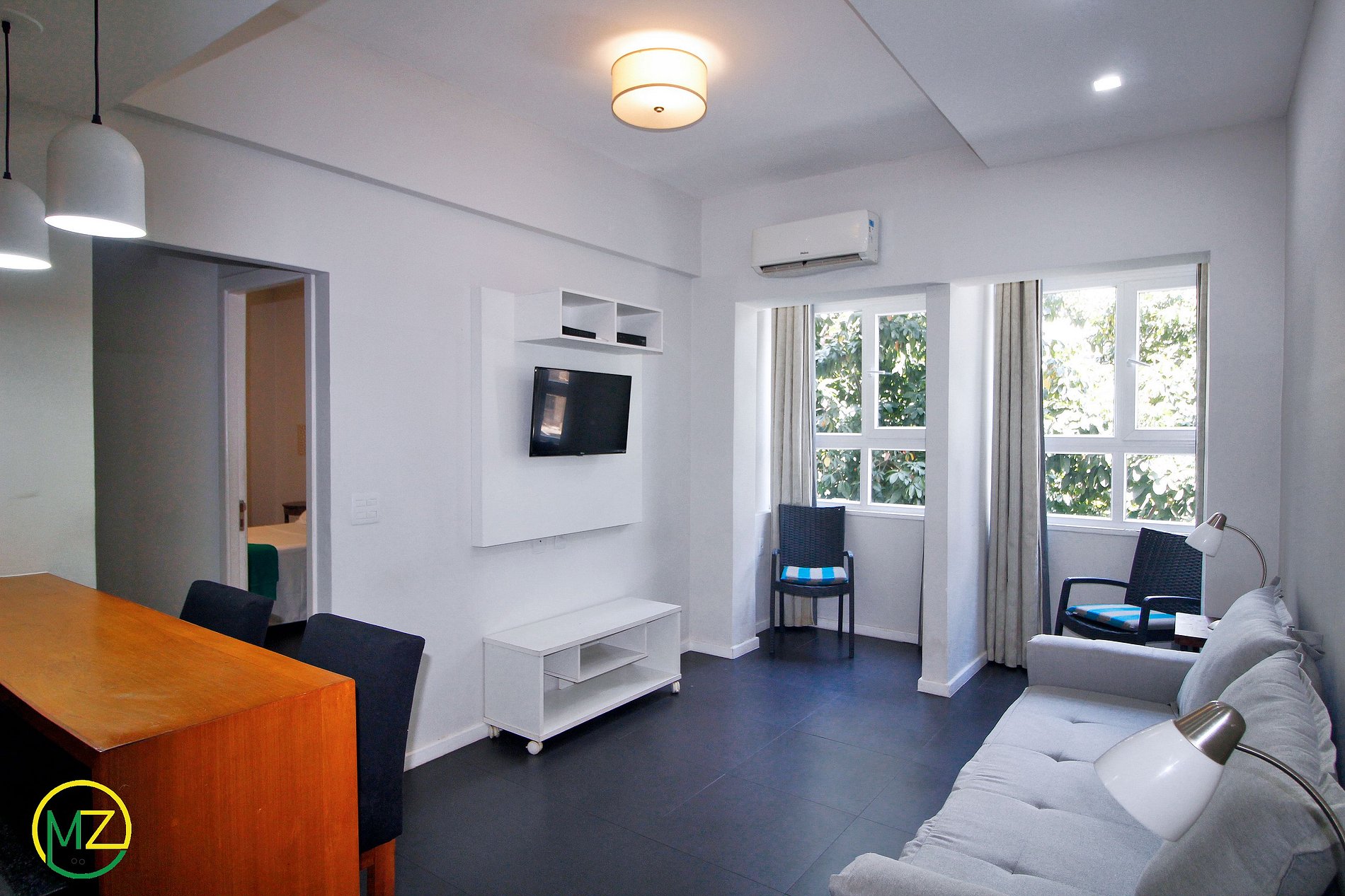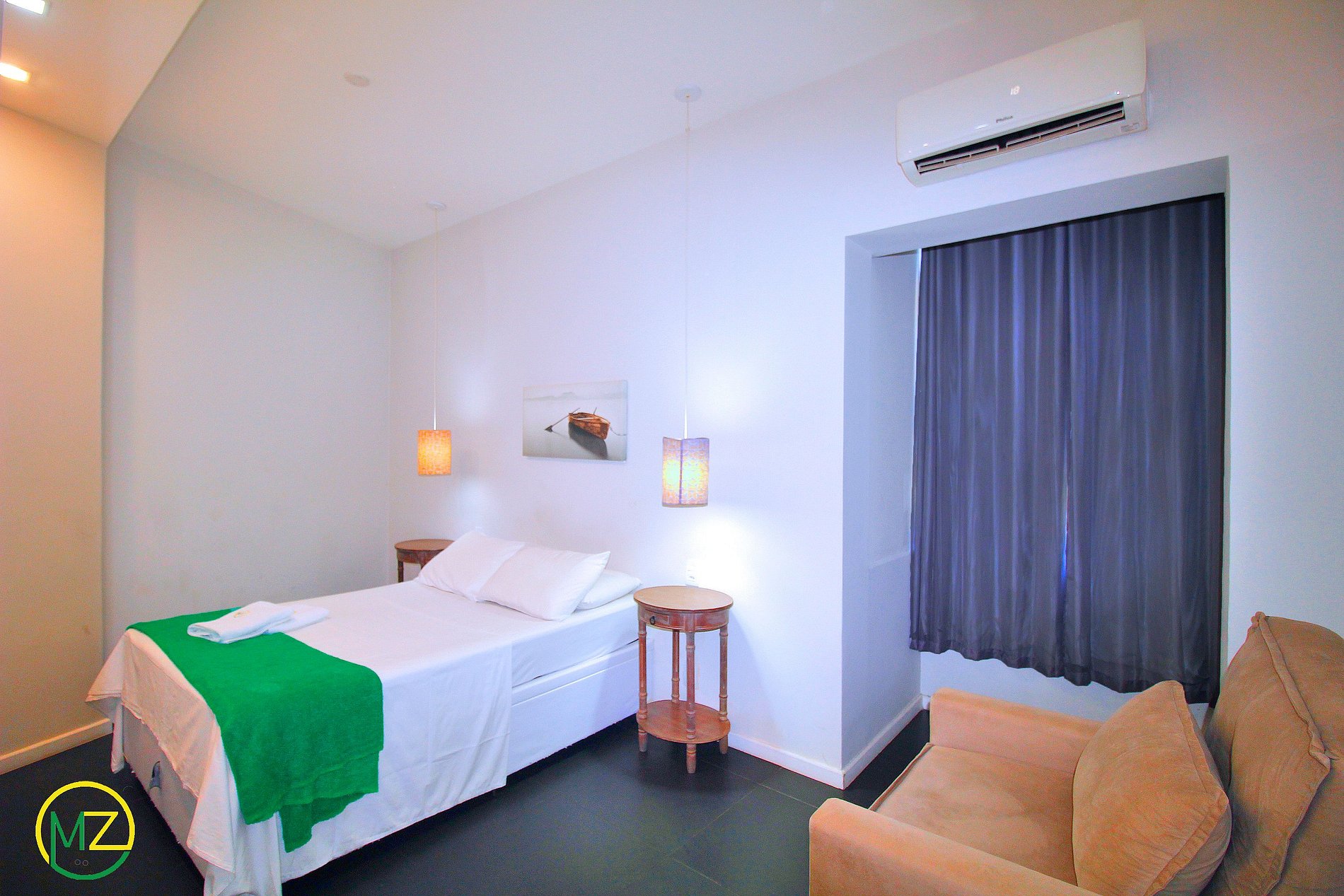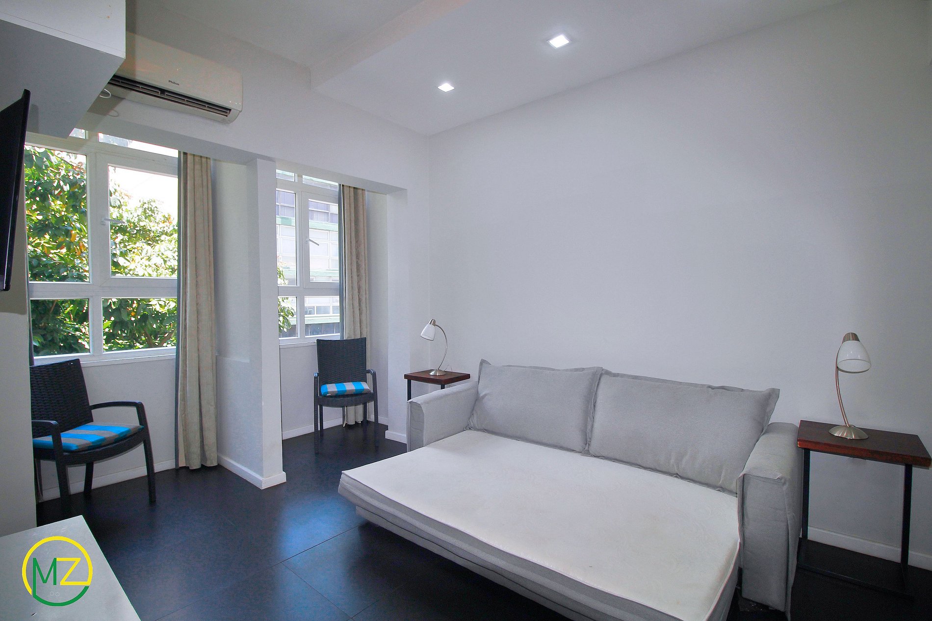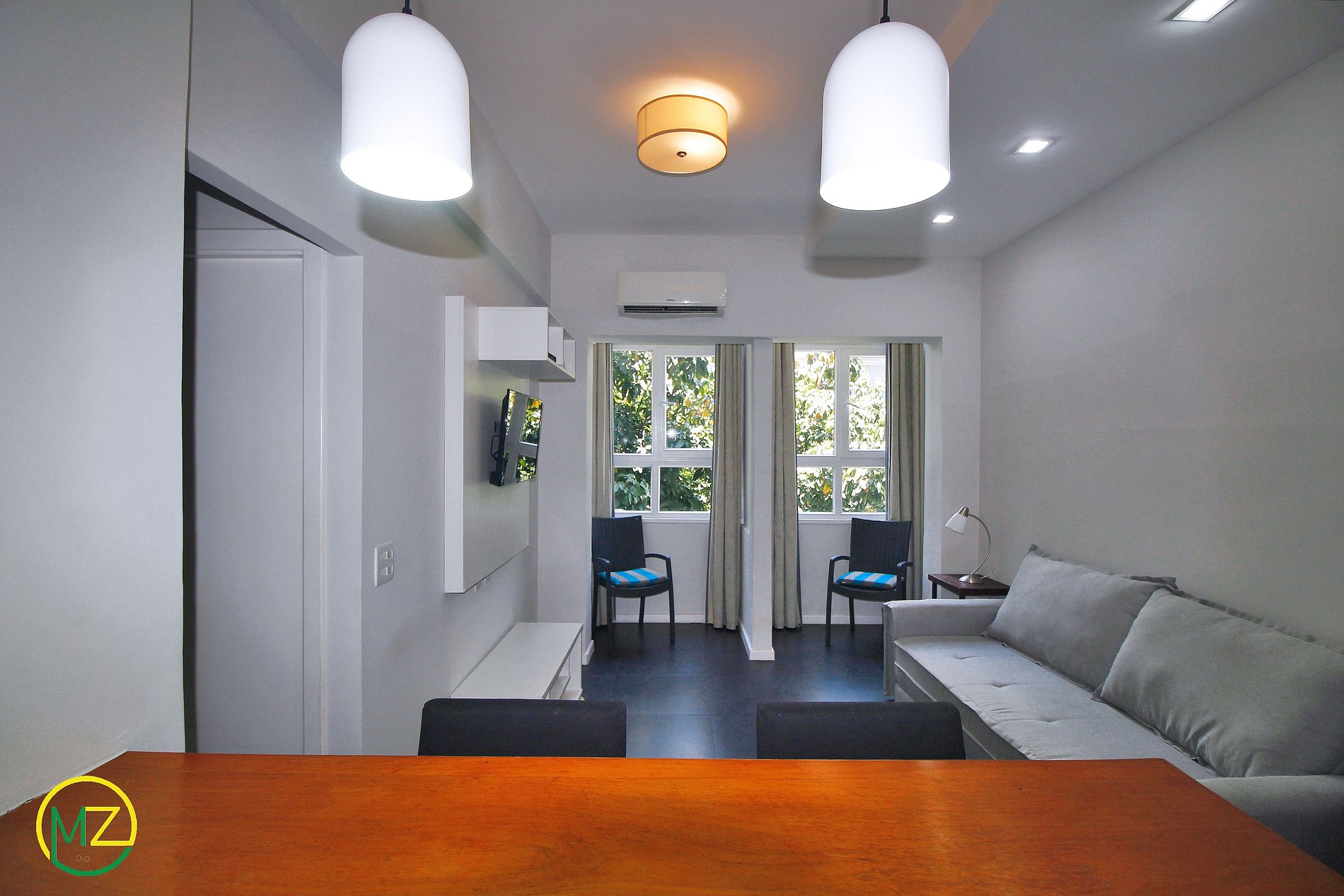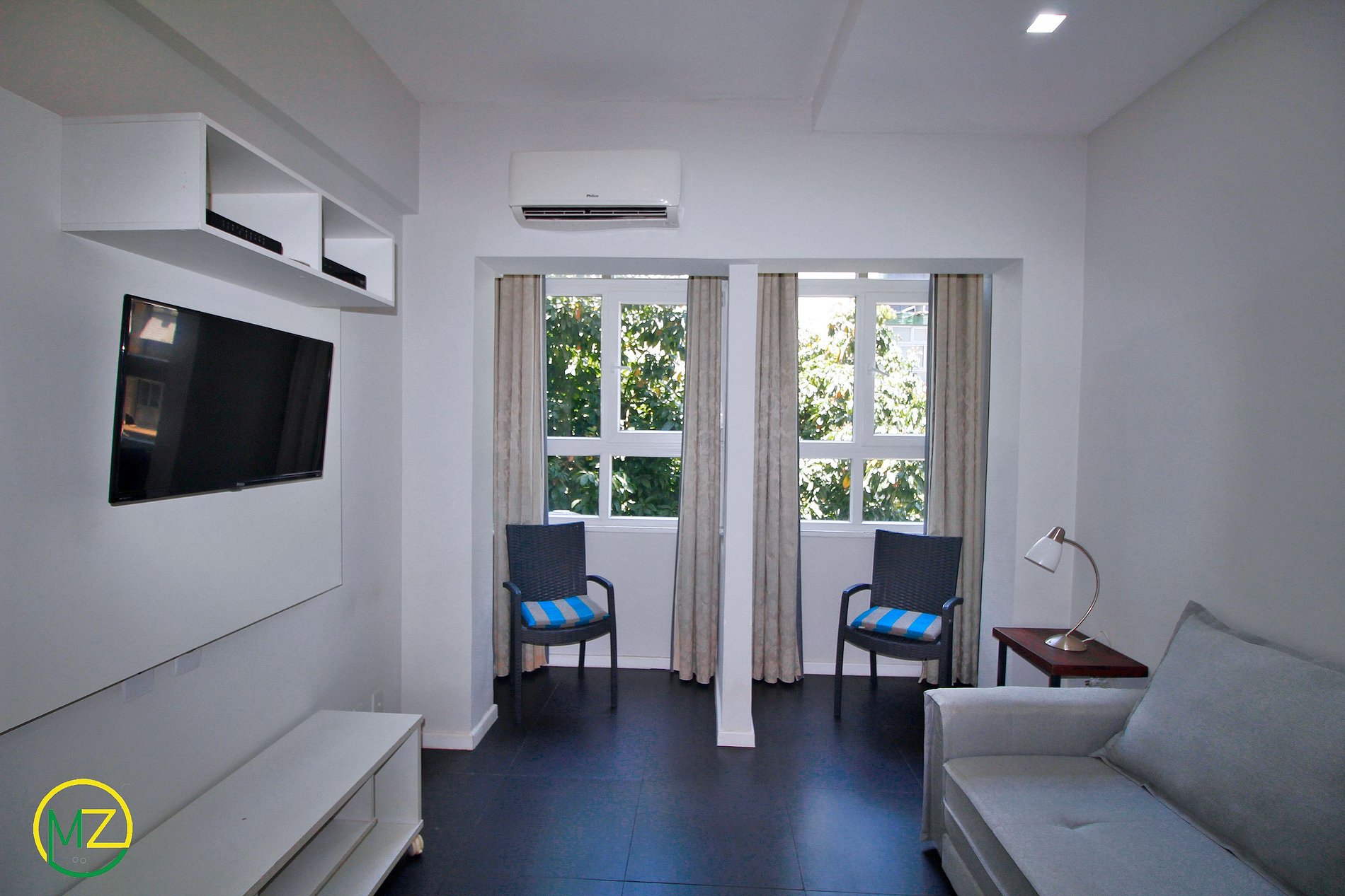 La habitación cuenta con ventanas anti-ruido, iluminación indirecta, banco con 2 taburetes, sofá cama doble, 2 sillas, aire acondicionado Split y TV LCD.
