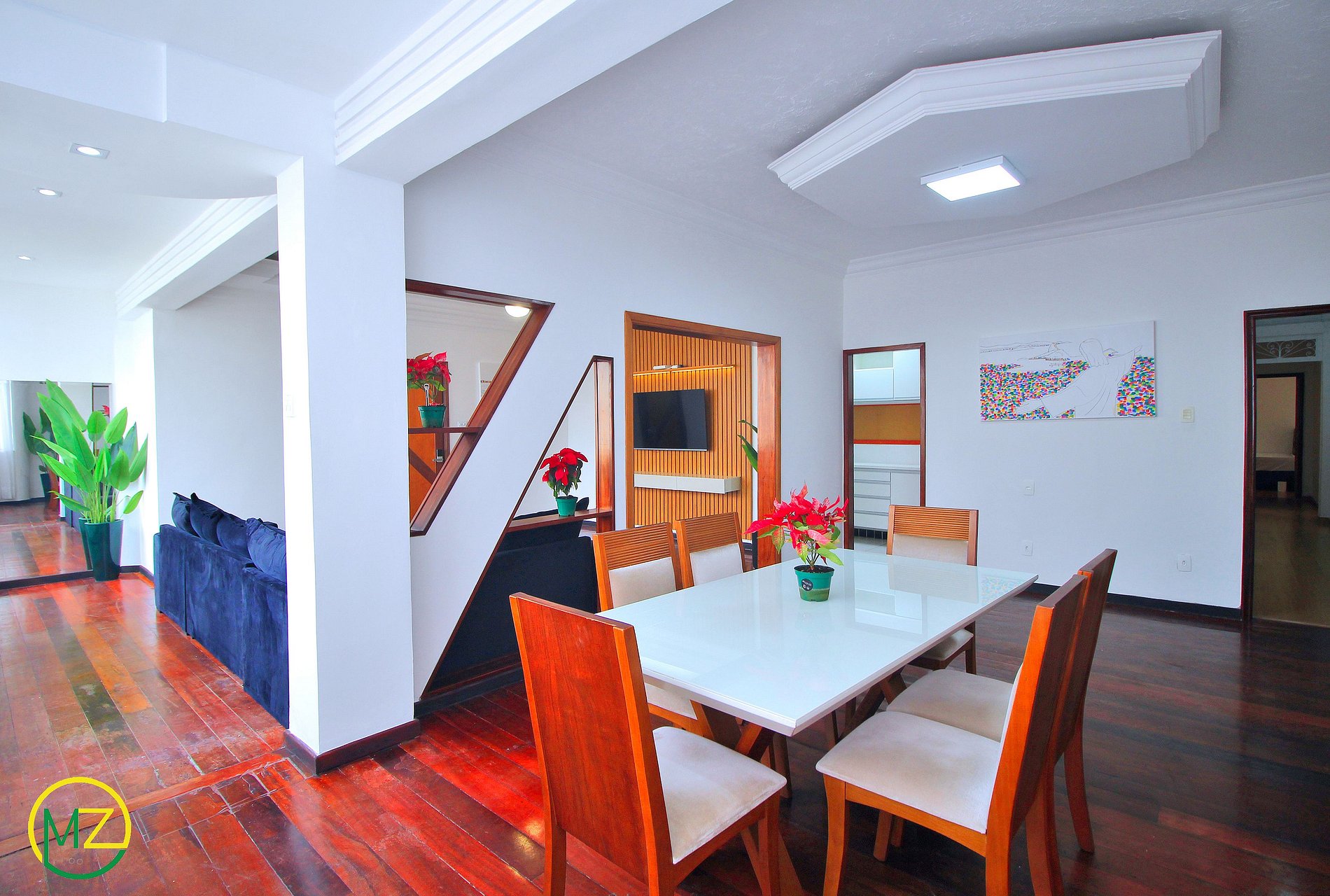 Na sala de estar tem um sofa grande para ate 6 pessoas, SmartTV de 50 polegadas e ventilador de teto. Sala de Jantar com mesa de jantar com 6 cadeiras. Cortinas de seda, NÃO É BLACK-OUT.