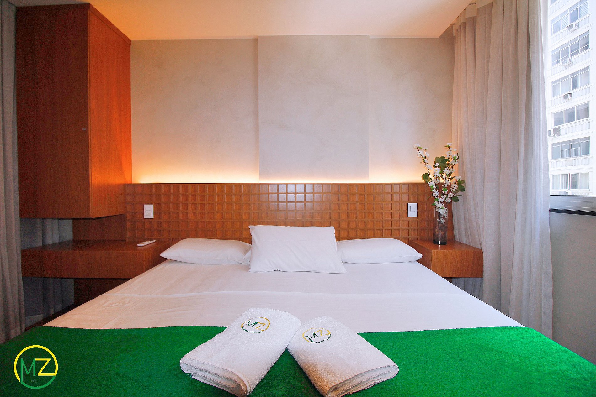 O quarto possui uma cama de casal KING, guarda-roupa com 1 porta, arara para roupas, janela anti-ruído e ar condicionado split.