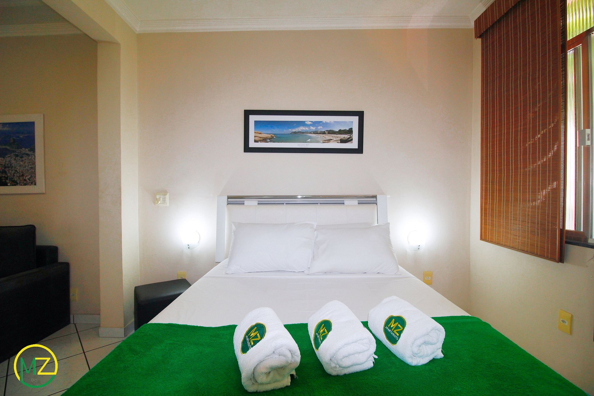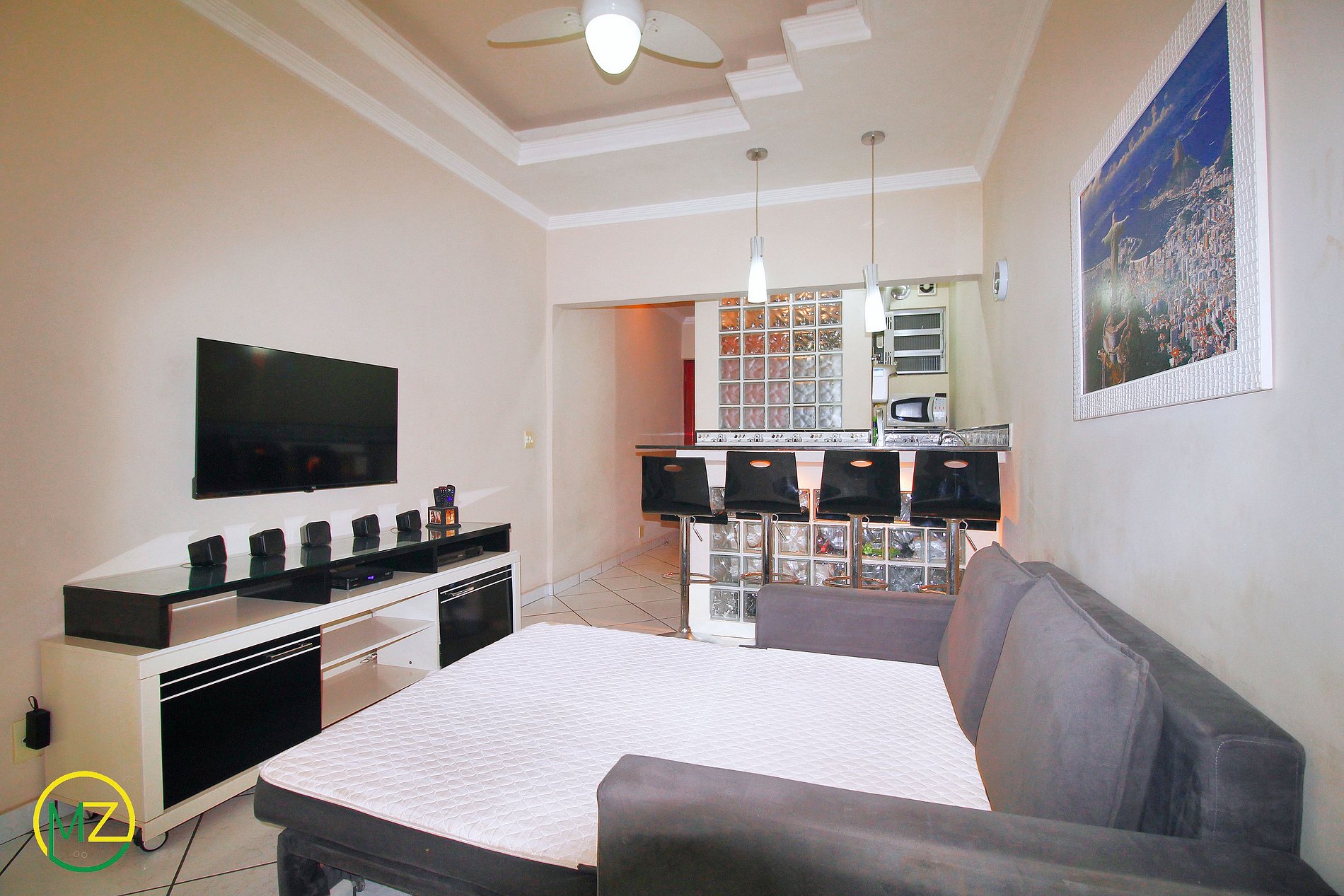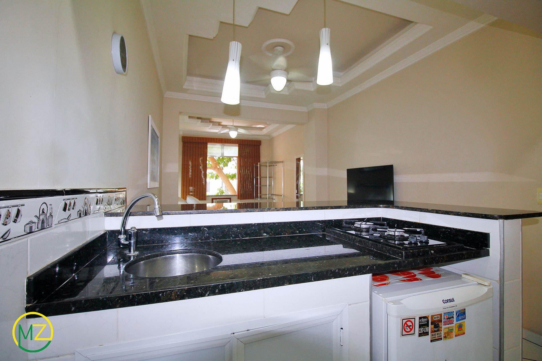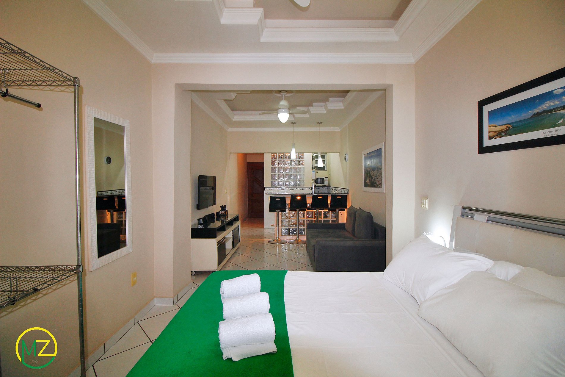 Imóvel de 30m² dividido em quarto, banheiro e cozinha americana. O imóvel esta equipado com uma cama de casal, sofa-cama de casal confortável, SmartTV com canais básicos, puff, 2 ventiladores de teto e ar condicionado. Cozinha americana com bancada e 4 banquetas para fazer as refeições, frigobar, fogão 2 bocas cooktop, microondas, filtro de agua potável e utensilios básicos para cozinhar.