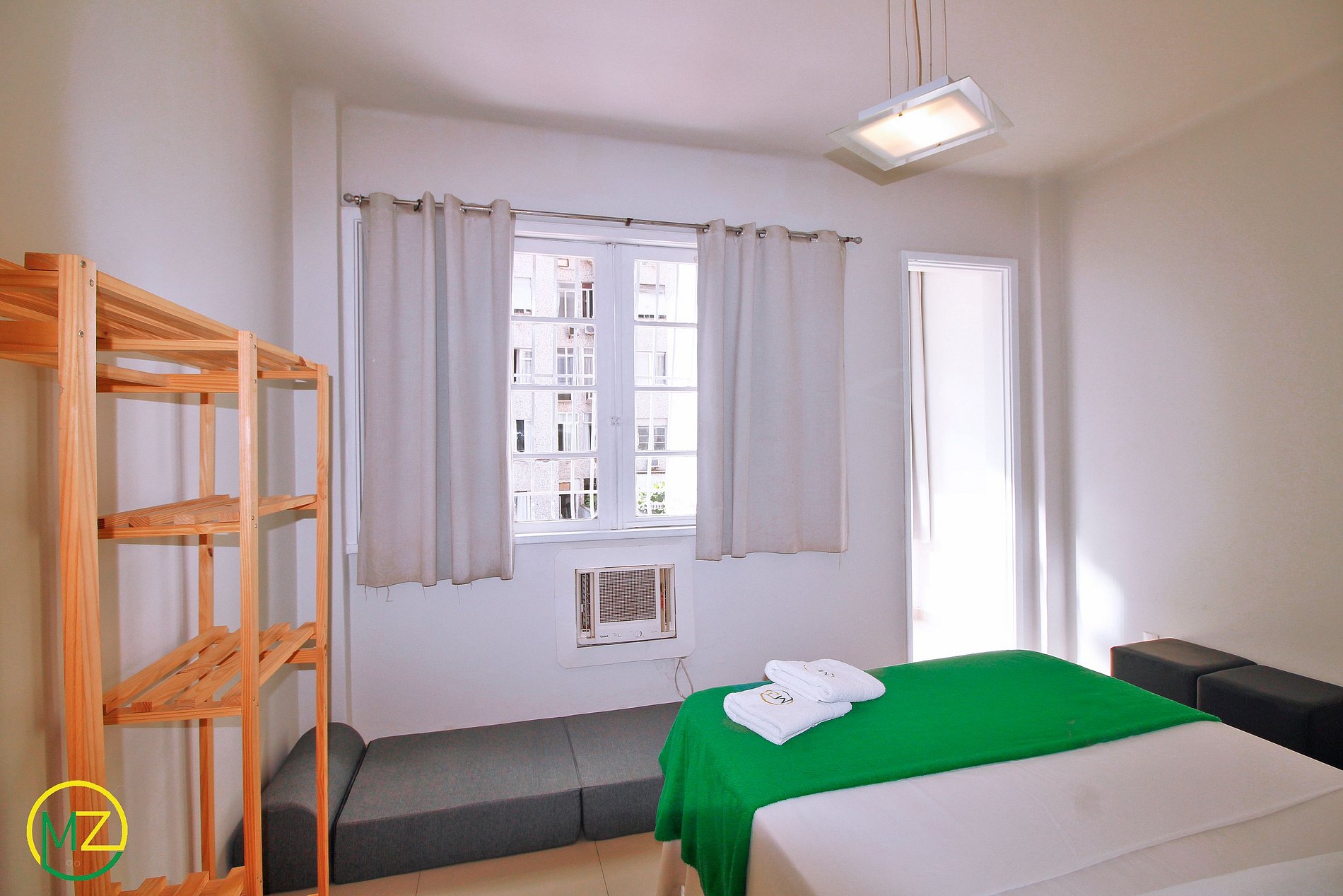 No quarto voce encontra um ar condicionado de parede, uma cama de casal, uma poltrona cama de solteiro e uma paleta para guardar roupas. Na sala tem uma poltrona cama de solteiro com uma SmartTV.