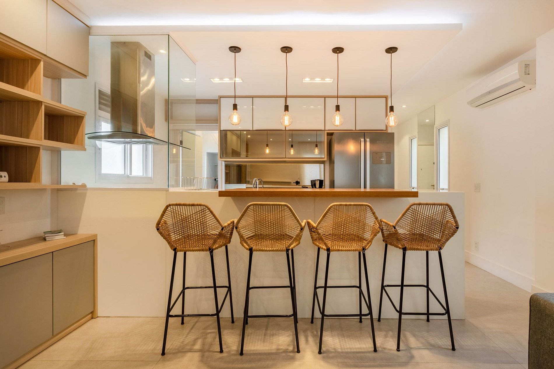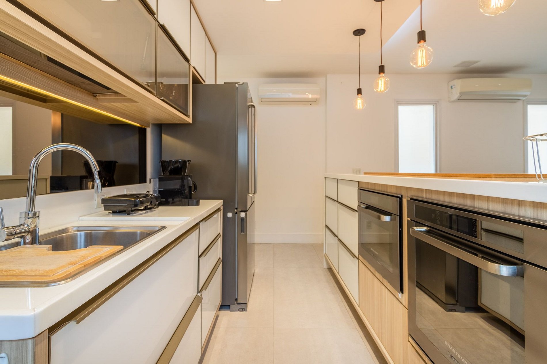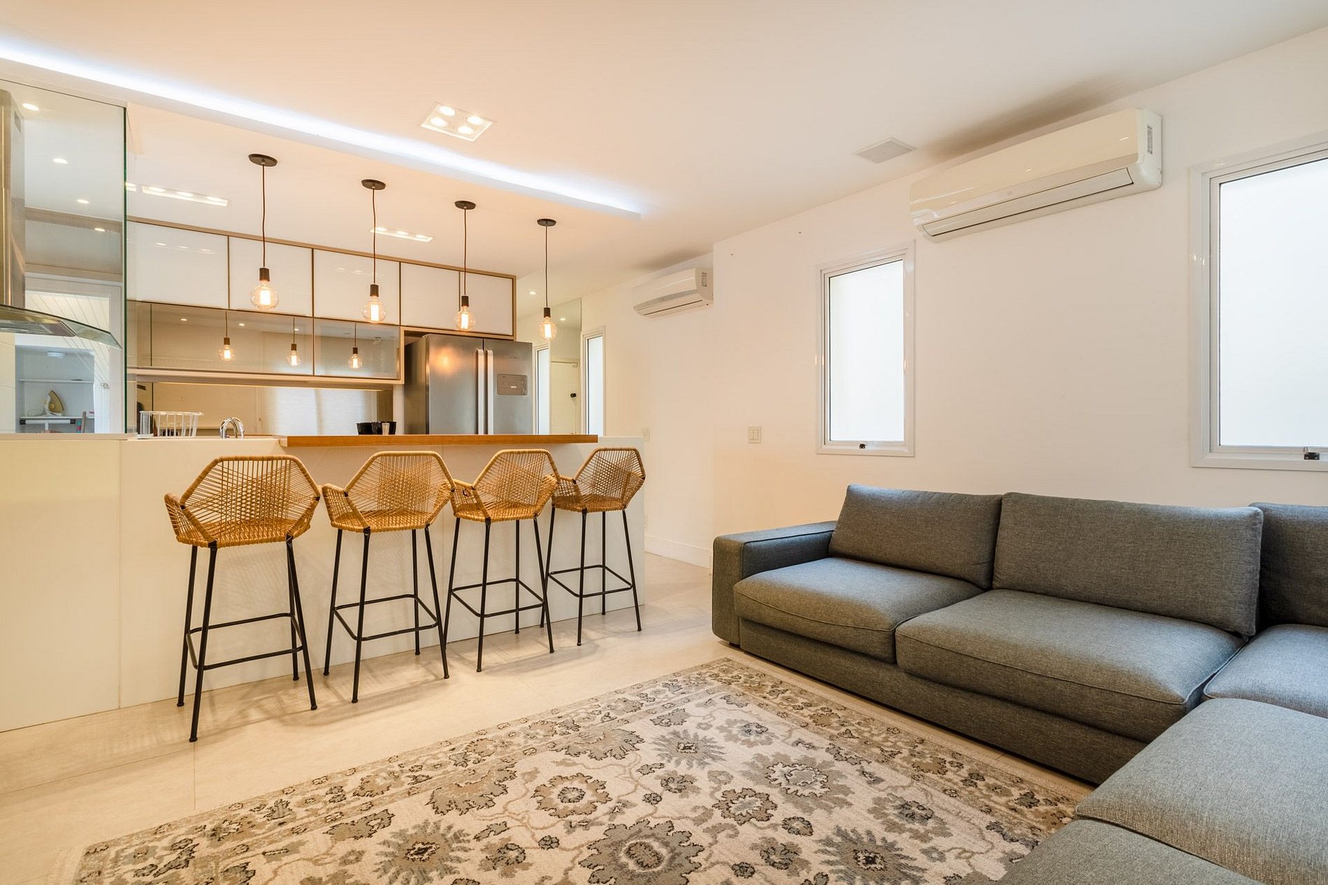 No primeiro andar, você encontra uma espaçosa sala de estar com um sofá grande em L, SmartTV e ar condicionado Split. A cozinha é aberta para a sala de estar com uma linda bancada e 4 banquetas, totalmente equipada com forno, cooktop, máquina de lavar louças, geladeira side by side e utensilios básicos de cozinha. Há também uma lavanderia ao lado com máquina de lavar roupas e um lavabo.