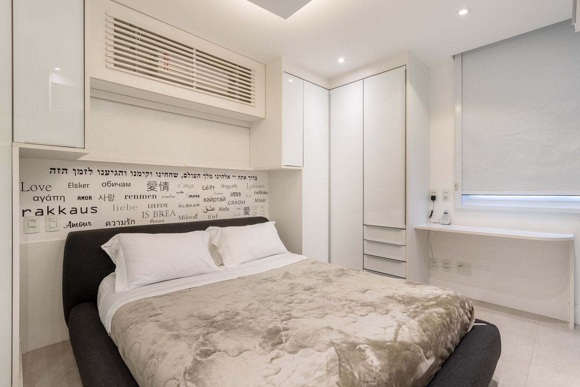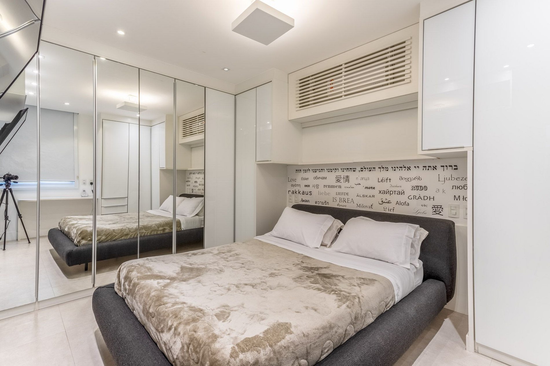 No segundo andar está localizada a suíte master com cama queen size, repleto de armários e com decoração elegante. Tem também o segundo quarto com cama de casal e um banheiro social dedicado à esse quarto. Os dois quartos são equipados com ar condicionado split para maior conforto.