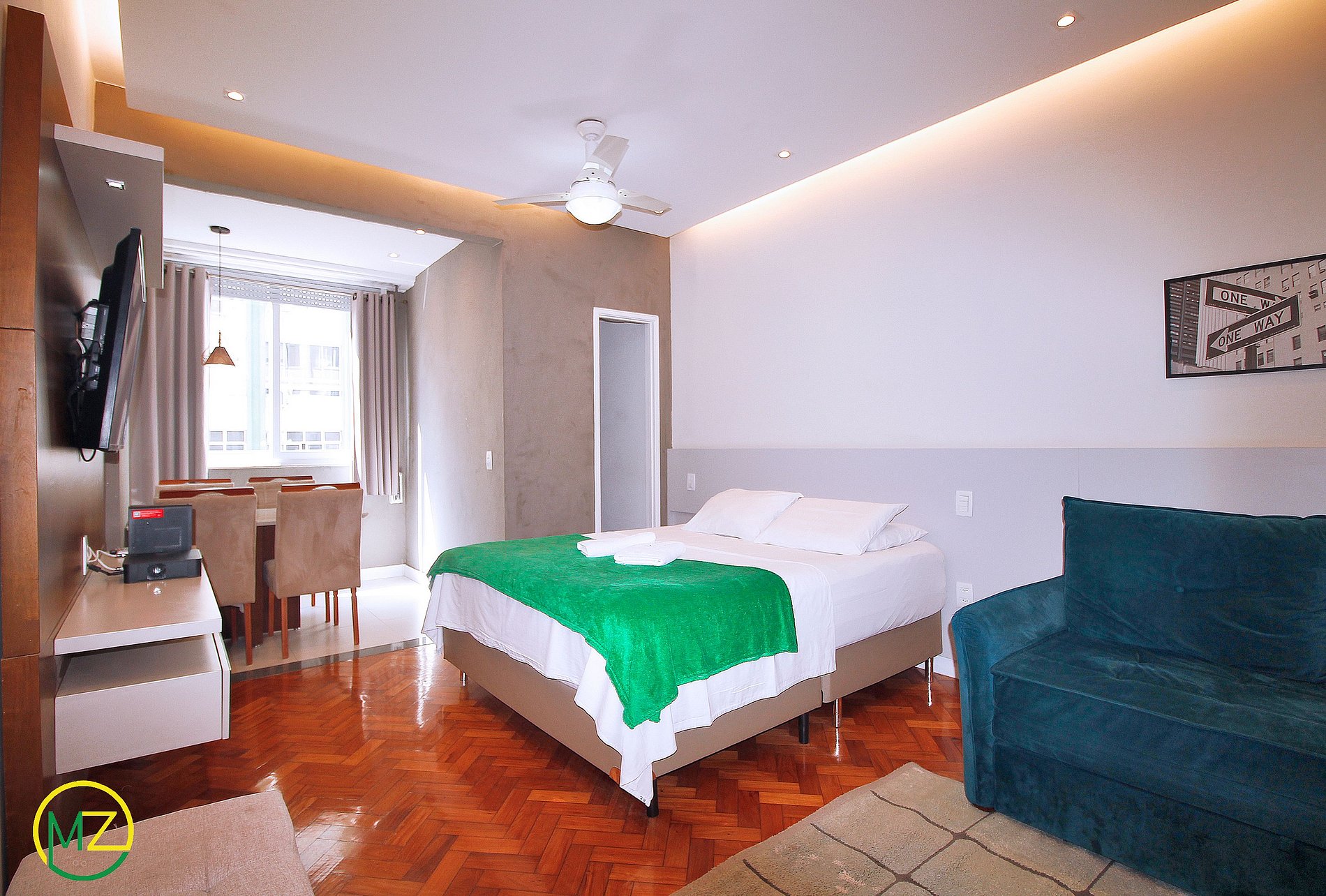 Studio renovado de 38m2 com vista parcial para o mar, dividido em quarto, cozinha americana e banheiro.
